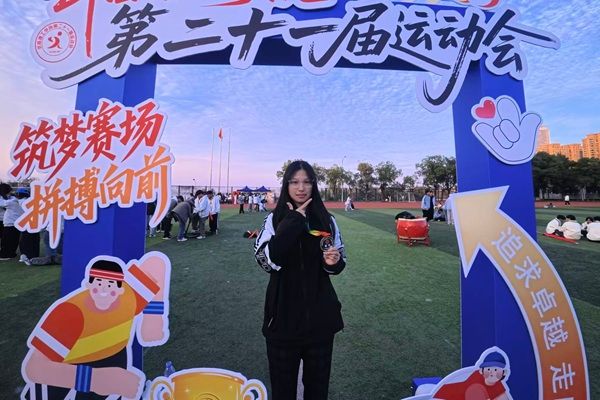 采访时葛怡婷站运动会主题拱门“筑梦赛场 拼搏向前”的背景下,她手持奖牌笑容道“能打破纪录很激动!这是对我训练的肯定,也希望能带动更多同学爱上运动,在自己的领域里突破自我。”眼神明亮地分享着这份喜悦与期许。(完)