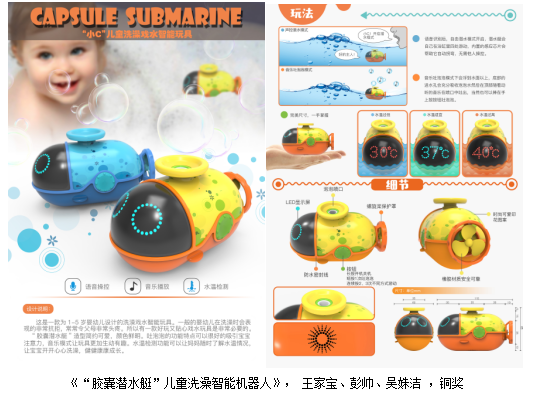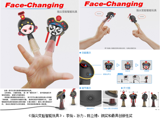 产品设计系以徐卓老师为大赛负责人,积极组织15、16、17级学生参与,共提交设计作品44件,其中15级学生李灿、孙力、陈立博的设计作品《指尖变脸智能玩具》创意新颖,脱颖而出,获得铜奖和最具创新性奖,奖金四千元;15级学生王家宝、彭帅、吴姝洁的设计作品《“胶囊潜水艇”儿童洗澡智能机器人》获得铜奖,奖金三千元;《Free World自闭症儿童智能遥控飞机》、《阿尔法儿童智能编程小火车》等获得优秀奖。304永利集团获得优秀指导院校奖,并获邀参加2018年在上海新国际博览中心举办的第十七届中国玩具展、中国玩具和婴童用品行业院校展示和校企对接活动,仅有二十所高等院校受邀参与,其中包括广州美院等知名院校。指导教师与获奖学生被邀请参加行业晚会与创意设计大赛颁奖典礼。