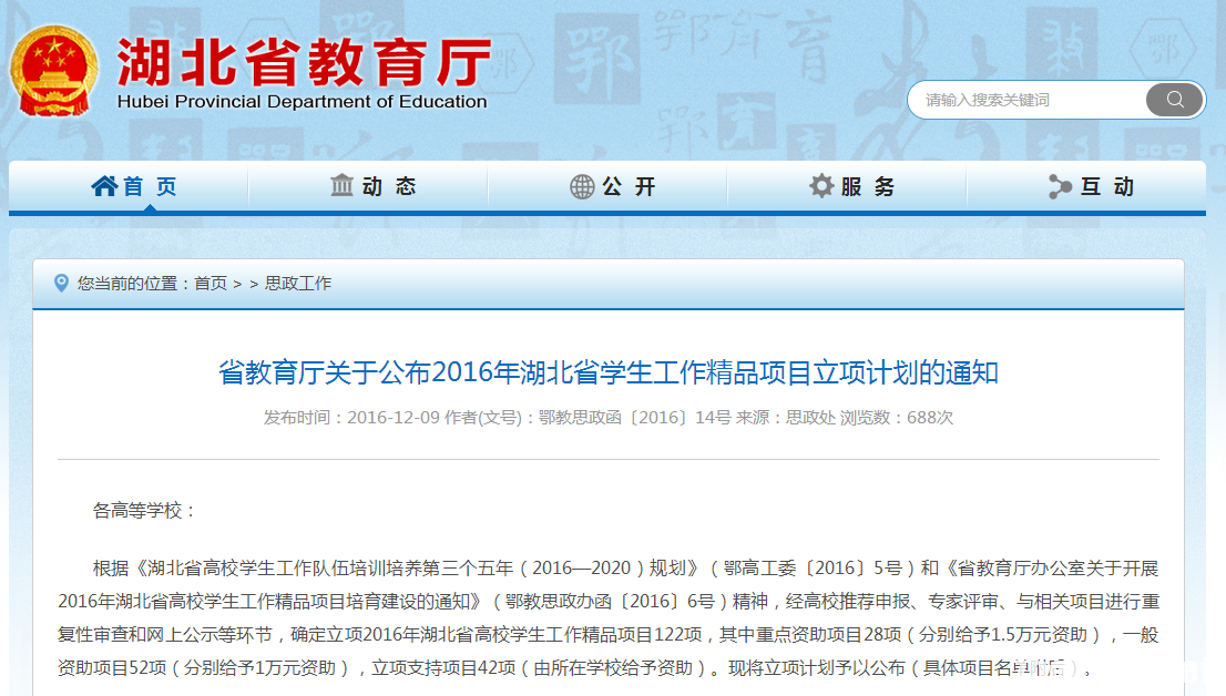 根据《湖北省高校学生工作队伍培训培养第三个五年(2016—2020)规划》(鄂高工委〔2016〕5号)和《省教育厅办公室关于开展2016年湖北省高校学生工作精品项目培育建设的通知》(鄂教思政办函〔2016〕6号)精神,经高校推荐申报、专家评审、与相关项目进行重复性审查和网上公示等环节,确定立项2016年湖北省高校学生工作精品项目122项。