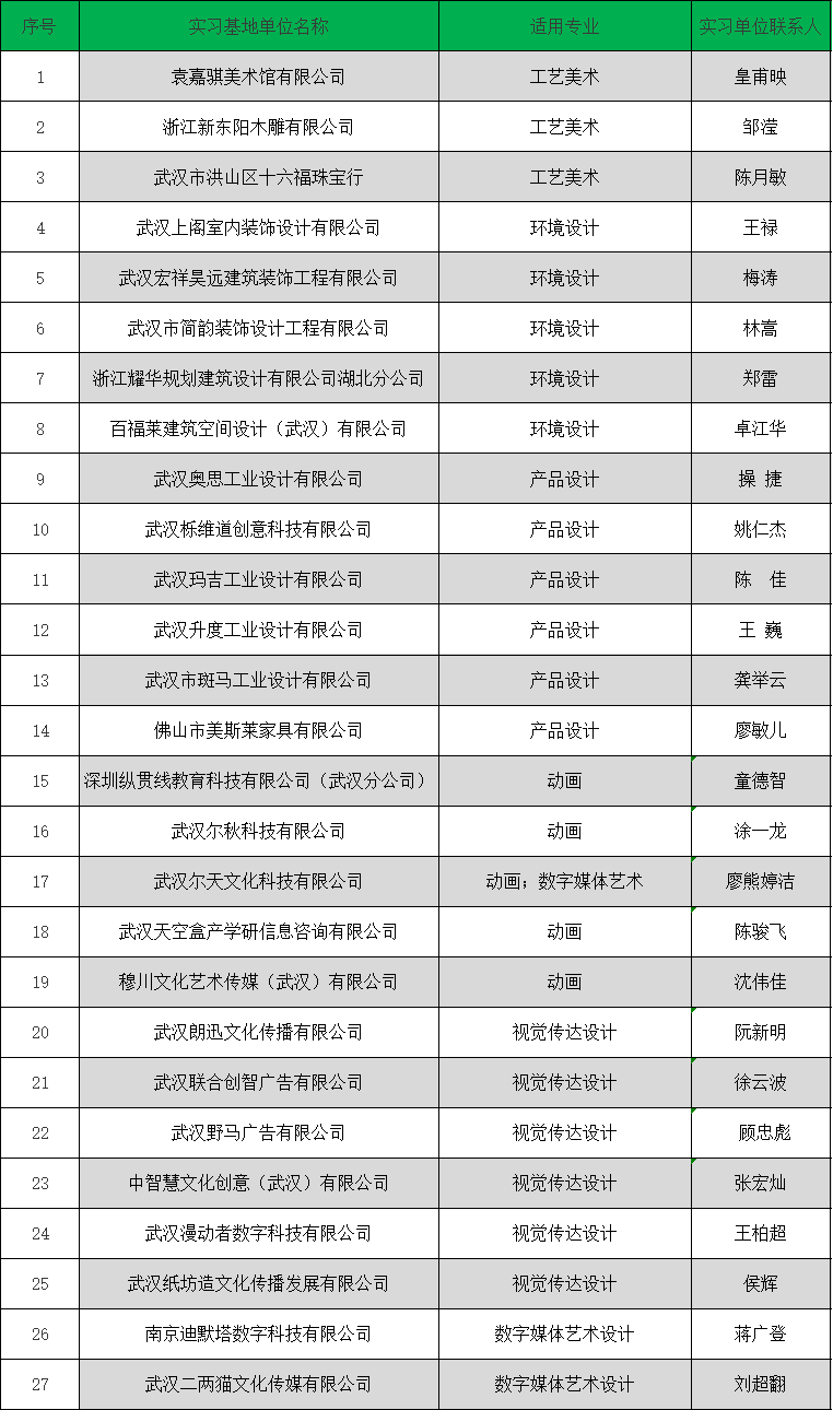 学院以产学研为路径,依托荆楚文化特色资源打造品牌专业,整合学院各专业优势资源,以建设“传承优秀文化、创新创意为先”为特色的创新团队,与袁嘉骐美术馆、屈家岭国家文化遗址公园、屈家岭博物馆、大洪山风景区、武汉栎维道创意科技有限公司、武汉宏祥昊远建筑装饰工程有限公司、浙江耀华建筑规划设计有限公司湖北分公司、武汉联合创智广告有限公司、武汉尔秋科技有限公司、武汉漫动者数字科技有限公司、南京迪默塔数字科技有限公司等研究机构和企业签订协议,建立了稳定的校外实践教学与科学研究基地。